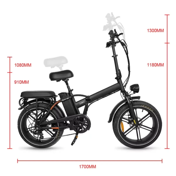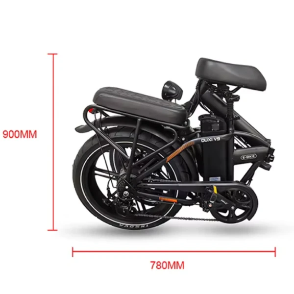 Um dos grandes diferenciais da OUXI V9 1000W Dobrável é o seu quadro de ferro dobrável reforçado, que une durabilidade e praticidade. Em poucos segundos, a bike pode ser dobrada e armazenada com facilidade em porta-malas, elevadores ou pequenos espaços, ocupando apenas 78 cm x 90 cm quando compactada. Além disso, sua suspensão dianteira absorve impactos e o assento duplo com amortecimento e regulagem de altura garante conforto até para dois ocupantes.